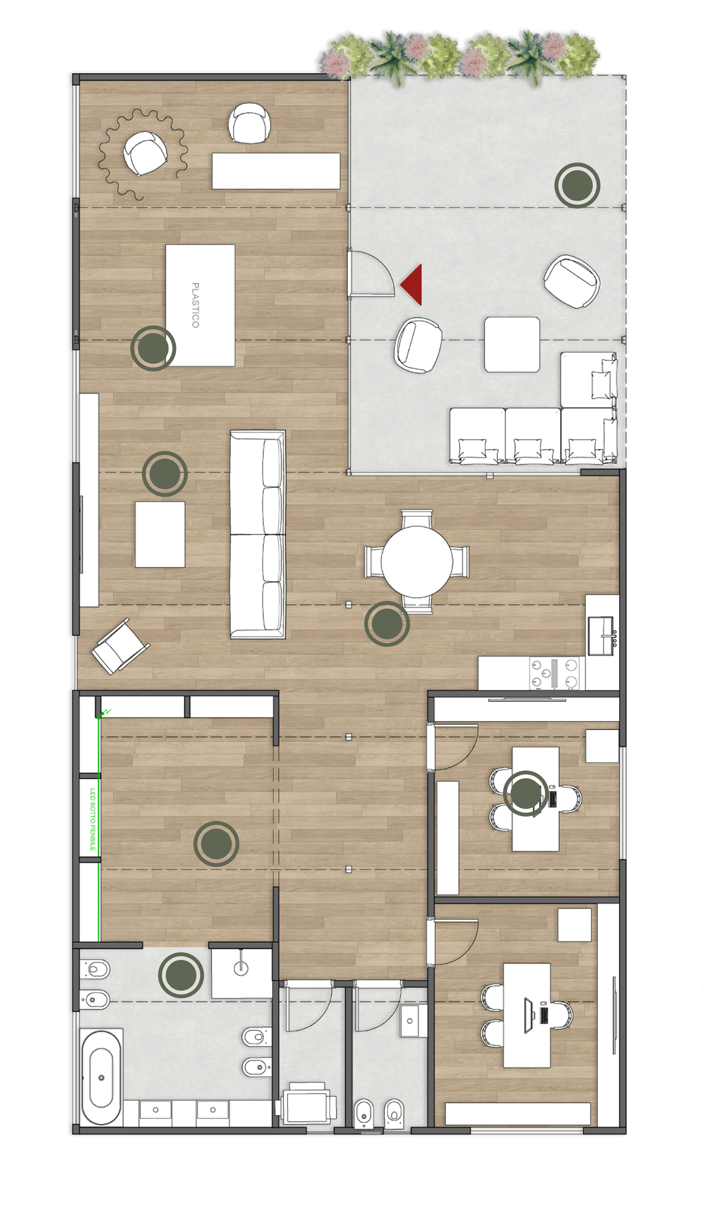 Muoviti all’interno degli ambienti come se fossi nella tua nuova casa: scopri le prospettive della zona living e vivi in anteprima la sensazione di luce e apertura garantita dalle grandi vetrate.